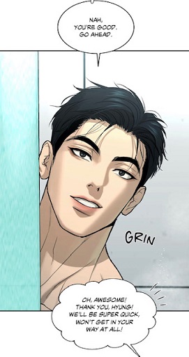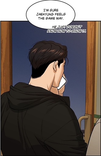 (chapter 39) Consequently, I could observe that the athlete is gradually capable to manage his jealousy, the longer he is living with the main lead. Simultaneously, I believe that the recent transformation of the physical therapist (exhaustion, skipping dinners) incited Joo Jaekyung to observe his lover and meditate.
