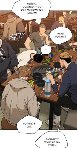 (chapter 45) This is a sign that the champion had liked that night, but exactly like doc Dan in the past, he chose to lie to himself out of fear. How is this related to Potato? Don’t forget that he was not present at the birthday party, but more importantly he was no longer acting as a supportive friend and confident. Because Yoon-Gu’s philosophy is not to intervene and to admire from afar, he is not realizing that he is actually abandoning Kim Dan and even Joo Jaekyung.