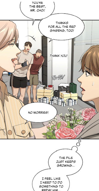 (chapter 31) Though he was not entirely honest to Kim Dan and to himself, his generosity towards the physical therapist was still genuine. In other words, the doctor is responsible for the actor’s change. What caught my attention is that the last gift at the gym were flowers, a sign that he was trying to convey his feelings differently. He was definitely more humble. Under this new aspect, it becomes comprehensible why the actor decided to hide his presence in the penthouse and still to confess his love in the café later. He could perceive the doctor’s innocence. He never saw him as a prostitute. His attachment to Kim Dan was stronger to the point that he chose to help the physical therapist in the end.