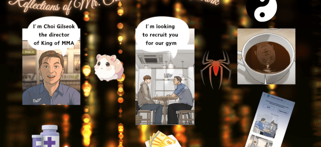 (chapter 37) This mysterious man dared to act as a MFC manager, though my intuition is telling me that he works for MFC. The irony is that by challenging constantly the champion, the plotters are not realizing that through their game, the truth is slowly coming to the surface. How so? In the last panel, the doctor noticed his origins: He is Korean indicating that the conspiracy started in South Korea. As you can see, Kim Dan was able to perceive a glimpse of the truth. Then at the café, Choi Gilseok confessed many things to the doctor: he owns the café, he has connections to the company F Pharmaceutical. Moreover, through this game, the champion is confronted with his fears and past. That’s how he can overcome his traumas. The doctor is the mirror revealing the monsters. Hence I come to the following deduction: the succession of new characters mirrors the champion’s past and traumas. The following characters are involved in the champion’s suffering, though the order of the appearance is exposing the gravity of the involvement: Heesung,