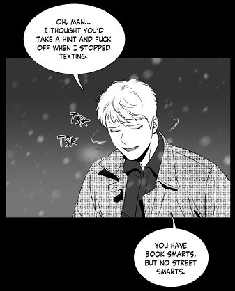 (Chapter 30) This panel reminded me of a rain of diamonds. Their encounter was magical making him realize how different Kim Dan is from anyone he had ever met. Furthermore, the physical therapist made him feel different, as he pushed him to discover his true nature. Hence I believe that we should see this courting from Heesung in a different light as well.