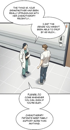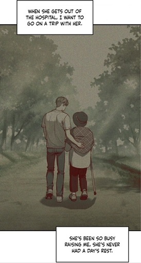 (chapter 47) Kim Dan imagined going on a trip with his grandmother, totally delusional, as he was in denial about his grandmother’s deteriorating health conditions. However, the vision shows the desire to become closer to his relative, to become more proactive as well. His words (“She’s been so busy raising me, she’s never had a day’s rest”) imply the presence of reflection. It indicates his gradual transformation and maturity. But this doesn’t end here. The tree was also present in the special episode 2: