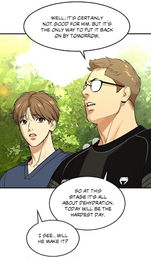 (chapter 43) He would have perceived this statement differently from the others, as he knew about the true nature of their relationship. On the other hand, his absence was necessary. Why? It is because the young fighter needed to learn to distinguish between himself and his idol. Yes, in my opinion, Yoon-Gu’s motivation to bring back Kim Dan to Team Black won’t be just for the athlete’s sake! It will be Potato’s own desire to bring him back. He is missing the physical therapist. Through the last incident, Potato must have realized how much Kim Dan meant to him. His departure left him so heartbroken.