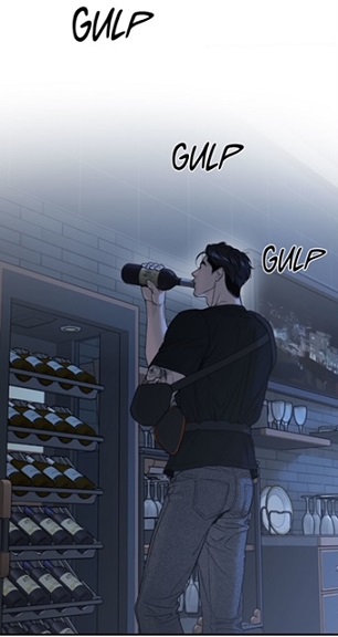 But Kim Dan does not respond the way he might have in the past. He does not flinch, but he also does not lean into it. Instead, he pushes forward with his emotional detachment, reinforcing the idea that their dynamic is no longer what it once was. On the other hand, I believe that this champion’s gesture symbolizes the future transformation of doc Dan. How so? The ear stands for communication and listening, and how was he described by the athlete during this sex session? Stubborn! (chapter 64) He refused to see and listen to others and to the athlete, because he was trying to deny the existence of his love. The reason is simple. He is trapped in his own world, full of darkness. He was trying to clinch onto the past, where he portrayed himself as a victim and doll of the champion. But the reality is that doc Dan treated himself as a doll or servant, for he didn’t value his own body. Hence he didn’t eat properly and drank soju to drown his pain. (chapter 5) This is a habit he had before he met Joo Jaekyung. Moreover the latter was living in abstinence, until he drank alcohol by mistake because of him.