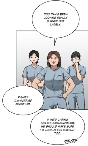 Secondly, by contrasting these bruises, I noticed a pattern. First, it was the doctor’s left eye, then the right eye. The bruises on the eyes symbolized the doctor’s blindness. The latter had been avoiding reality. At the same time, the purple eyes exposed people’s sightlessness and indifference. Later the physical therapist injures his hands and knee, but no one intervened again. (chapter 43) They imagined that rest was the best solution, something the champion had heard from Cheolmin before. That’s why he listened to his manager’s suggestion. He let him sleep instead of urging him to eat something. He had heard that rest was crucial forgetting that Kim Dan was suffering from malnutrition. (chapter 13) The latter was the cause for the severe exhaustion. However, like mentioned above, the doctor is not blameless either, because he never questioned why his wounds on the hand were bleeding again. (chapter 43) He thought, it was related to the massage, yet the reality was that this incident showed that he had coagulation issues. To conclude, all the bruises could have always been noticed by people due to their locations (eyes, hands, arm)! (chapter 11) While the manager and Kwak Junbeom saw the injury and accepted the “excuse”, the nurses are now no longer paying attention to Kim Dan’s well-being contrary to the past. The bruise on the doctor’s arm reflects the staff’s neglect: they are not helping him. They are now more obsessed with handsome guys (chapter 61) and his relationship with Joo Jaekyung. (chapter 61) That’s how I recognized why these women’s warm welcome and curiosity about Kim Dan were rather superficial. (chapter 56) His arrival stands for novelty and a breath of fresh air at the institution. However, with this change, the female staff is forgetting their original duty: they need to pay attention to their colleagues. They are behaving like the grandmother (chapter 61): fangirling over the handsome guys visiting their little town. That’s why Mingwa drew flowers in the last two images. No wonder why no one around Kim Dan is observing the bruise and his deteriorating condition. Moreover, since the physical therapist has a relative at the hospice, the staff is envisioning that Shin Okja is doing “her work”, she is paying attention to Kim Dan’s mental and physical conditions. On the other hand, there is no doubt that the grandmother has already delegated her own responsibility onto others, Kim Dan and the hospice. It is a medical institution, therefore they should pay attention to his working conditions. In other words, since no one feels responsible for the protagonist’s health, no one is worried about Kim Dan at all. At the end of episode 61, he is even so pale and breathless (chapter 61) that I am anticipating a terrible incident leading to a rude awakening for everyone.