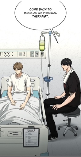 Kim Dan, however, misinterprets Jaekyung’s words. First, the athlete employed the expression “usual pre-match routine” which is quite ambiguous. What was he referring to “usual pre-match routine”? The sex or the treatment he was receiving from Kim Dan: the tasty breakfasts, his company on his way to the gym (chapter 46), the stretching and massage at the gym? The problem is that the champion never complimented the “hamster” for his good work directly. So it was, as if his dedication was nonexistent. Without the champion’s genuine gratitude and appreciation expressed so openly, the physical therapist couldn’t perceive the true message behind the champion’s. Joo Jaekyung’s statement was actually an acknowledgment—a sign that the fighter values their routine, not just for performance but as an integral part of his life. So when the star mentioned his jinx (chapter 62), the doctor’s memory got triggered. Because of his past experiences, he has long associated the jinx exclusively with sex. This contrast in understanding highlights both Jaekyung’s lack of self-awareness and Kim Dan’s tendency to filter reality through his own expectations and trauma. However, the deeper significance lies in Jaekyung’s evolving perception of dependency. His jinx is no longer just a superstition tied to his performance in bed. It now subtly acknowledges that his success has been intertwined with Kim Dan’s intervention. (chapter 62). At the same time, his skills in the ring become more relevant. This explicates why the champion talked about it on the treatment table. The location is not anodyne. This implies that the champion’s torment is moving away from the bed and bedroom. This is not the first time the celebrity has recognized Kim Dan’s good work (chapter 61) By entrusting his care to Kim Dan, he was insinuating that the main lead was trustworthy and competent, yet his inability to verbally express appreciation keeps the doctor unaware of his true feelings. This struggle resurfaced in front of the hospice, where Jaekyung could only bring himself to admit that Kim Dan was not responsible for the incident with the switched spray. (chapter 62) His reluctance to openly acknowledge his gratitude suggests a deeper internal conflict—one that hints at a growing but unspoken emotional reliance on Kim Dan.