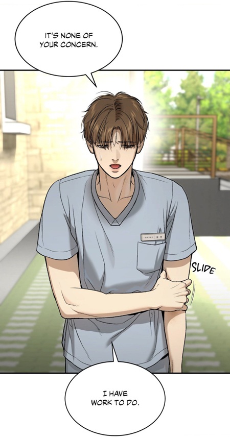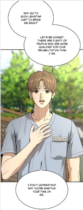 The setting also reflects the champion’s role in Kim Dan’s life. Joo Jaekyung’s presence at the hospice symbolizes a potential turning point (chapter 61), where Kim Dan might finally confront his suppressed emotions and begin to heal. However, the pivotal detail lies in where Joo Jaekyung first notices the bruise on Kim Dan’s arm—not within the hospice but outside, in front of the building. This distinction is significant, as it suggests that Kim Dan’s true healing will not occur within the confines of the hospice itself, but in the broader expanse of nature, away from the constructed sanctuary. It hints at a deeper connection to the natural world as a source of renewal and recovery, a theme subtly woven into Kim Dan’s earlier reflections.