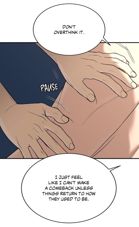 This rigid conditioning is reflected in Jaekyung’s relationship with his own body and sexuality. He was formed into this model. I don’t think, the champion was able to perceive his own beauty in the past, (chapter 1), until he received the doctor’s massage in chapter 1. His attitude toward sex mirrors his training in the gym—focused on endurance, performance, and control. His body is a tool, a machine honed for efficiency. (chapter 63) Pleasure is secondary; the real goal is lasting, enduring, proving his stamina. Even in his most intimate moments, he is competing against an invisible opponent—his own ingrained fear of inadequacy.