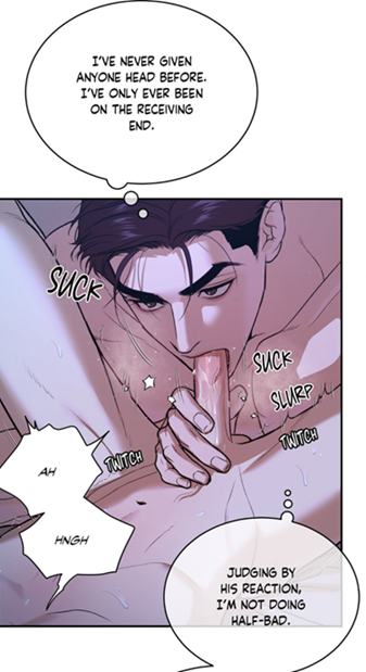 In stark contrast, Episode 63 presents a very different Joo Jaekyung. (chapter 63) Here, he no longer portrays himself as the benevolent provider of an experience. (chapter 63) Instead, he openly admits his inexperience in giving pleasure, stating that he has never been on the giving end before. This moment of self-awareness is crucial because it marks a departure from his earlier arrogance and lack of honesty. No longer does he assume that his presence alone is a gift—he is beginning to recognize that intimacy is a two-way street. Moreover, unlike in Episode 12, where his so-called generosity was partially performative (chapter 12) – seeking both to display dominance and to elicit validation (chapter 12) —this time, in Episode 63, he prioritizes Kim Dan’s pleasure without explicitly expecting anything in return. (chapter 63) However, there remains an unspoken desire for recognition, as he unconsciously longs for Kim Dan to acknowledge his efforts in a way that he was once too proud to admit. I believe that this night is there to make him discover the power of giving.
