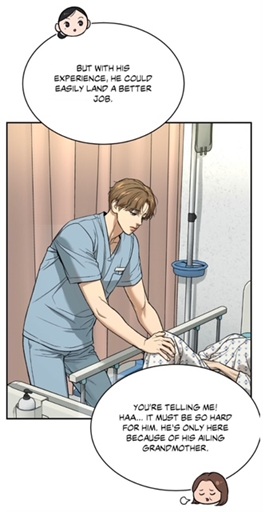 (Chapter 57) He moves between teams, unanchored and isolated. This also explicates why the nurses still have no name. To conclude, his contract implies that Dan is paid by the hour or per shift, without salary-based benefits. I am suspecting, the regular nurses likely operate under different contracts, which could include fixed shifts, team integration, and better protections.