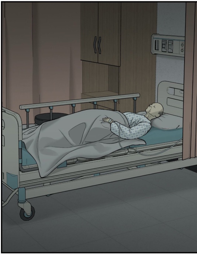 (Chapter 70) If something were to happen to the physical therapist, who is responsible? This means, there’s no one at the Light of Hope paying attention to doc Dan. It is, as if Dan has no family, and within the hospice structure, no voice. Yet, I saw a change in the following panel.