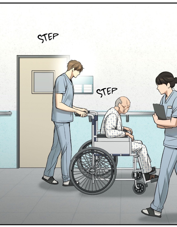 (chapter 71), suggesting his ongoing pattern of overworking. In episode 71, Kim Dan is seen walking alone through the hospice hallway—unaccompanied, unnoticed. This quiet image stands in stark contrast to the earlier scene when, after nearly drowning, he was carried in by Joo Jaekyung and immediately met by a nurse and the hospice director, both actively working together that night.