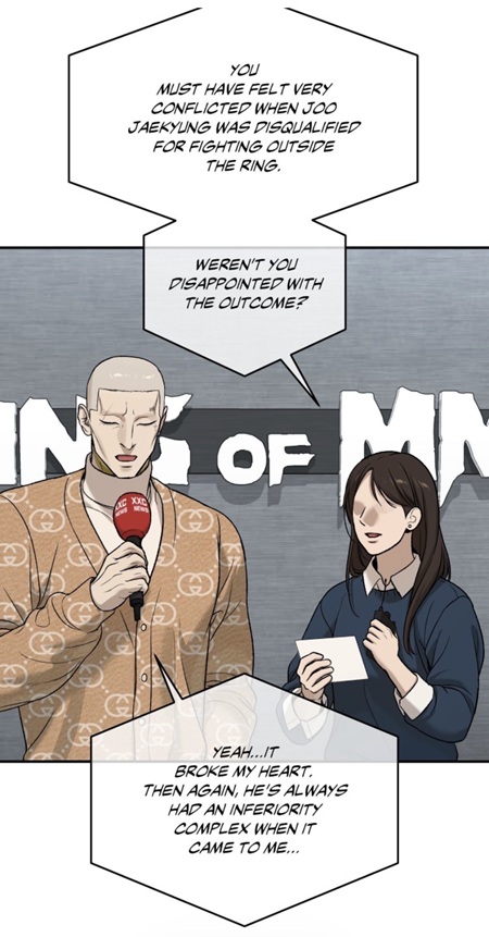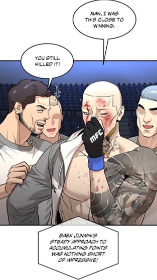 (chapter 52), notably among the members of King of MMA. This persistence is not merely rhetorical; it reflects a deeper uncertainty regarding the legitimacy of his rise. Within the fighters’ own environment, the outcome of the match is not experienced as a clear victory. Baek Junmin himself acknowledges that he was “this close to winning,”