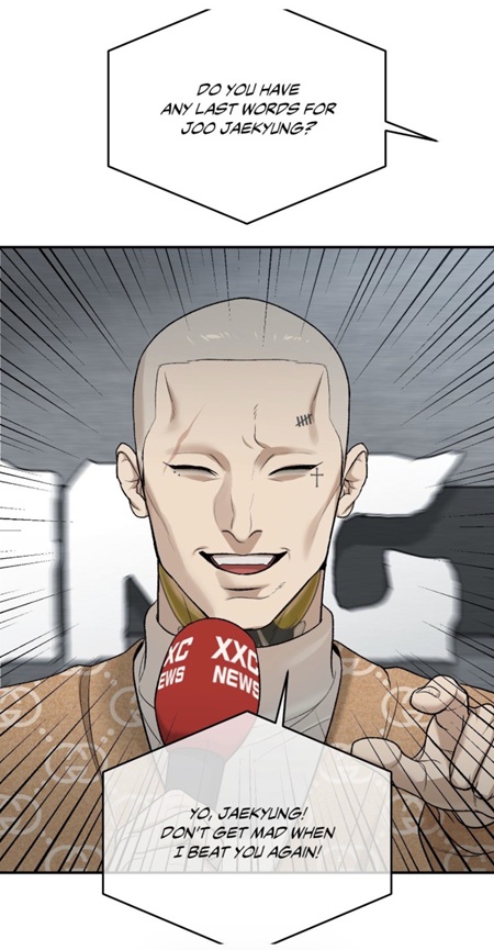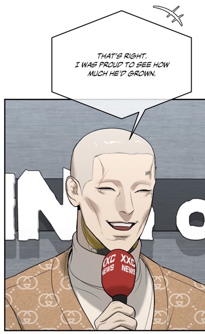 (chapter 75) The latter’s rise was marked by a visible title, publicly attached to his name and career trajectory. Baek Junmin, by contrast, occupies the position of champion without passing through the same symbolic sequence of recognition. All this time, he was working in the shadow, in the illegal underground fighting. What he inherits institutionally, he does not fully possess symbolically. He may occupy the position of champion, but the conditions of his ascent prevent that position from being fully recognized as legitimate. The label that once signified ascent is never replaced by one that would confirm his dominance. At the same time, his stage name The Shotgun