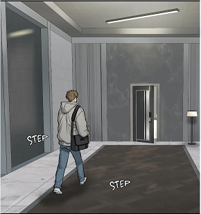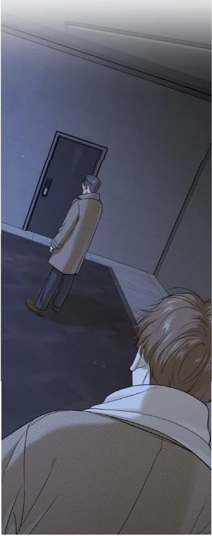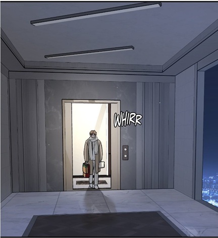 (chapter 97), where one would naturally wait if the goal were immediate contact. Instead, he has placed himself farther down the corridor. This matters because distance creates delay. Kim Dan must first step out, walk forward, and commit himself to the space before fully realizing that someone is there. By the time recognition becomes possible, the elevator doors have already closed behind him.
