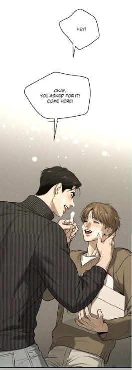 (chapter 97), but carries a birthday cake covered in cream — an object already charged with recognition, celebration, affection, and the wish to create a shared moment. Just as importantly, playfulness is no longer absent from Kim Dan’s inner world. The man who once moved through life almost exclusively through duty, anxiety, and endurance is now capable of imagining teasing intimacy, shared fun, and lightness with Joo Jaekyung.