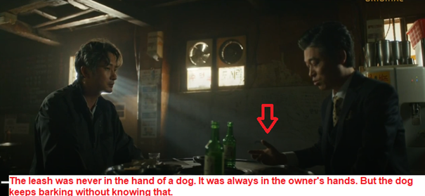 While the chairman Jo is looking at his hand, he claims that his position as master should never been questioned. He considers himself superior to Tae Soo and the congressman Seo Won Seok. He is not just a master, he is even the owner of the dog. That’s why this terrible man has no problem to order Tae Soo to get rid of the “dog” Seo Won Seok as he is no longer obeying his orders. The master will never dirty his hands, although he is the real murderer and mastermind.