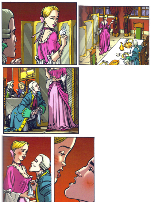 (chapter 35) Here, the low-born’s head is down which indicates a certain resignation and pain. While the one did change his behavior and showed a new side to the young painter, the other remained indifferent. The caress on the cheek could no longer mask the learned sir’s lack of concern and selfishness.