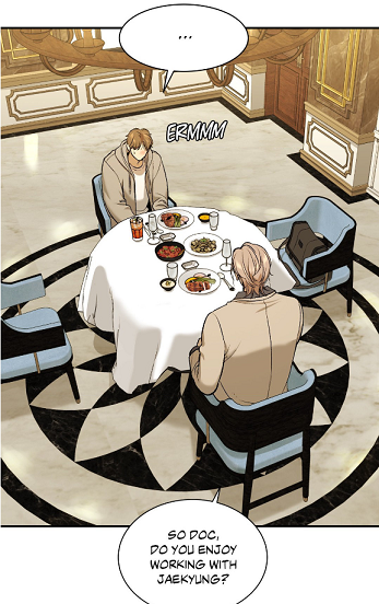 (chapter 85) Dan is lost in his thoughts — anticipating the night ahead with the champion — and has barely touched his food. Park Namwook notices this. One might think, such a remark displays the manager’s concern for the main lead’s well-being. However, the manager adds that the other members of the team are all almost finished. With such a remark, it becomes clear that the manager is urging the protagonist to finish his plate. Although Park Namwook addresses Dan as if showing concern, the content of his remark betrays his true priority: not Dan’s well-being, but the team’s schedule. By pointing out that ‘the rest of us are almost finished,’ he urges Dan to keep pace, treating him as staff who had to follow the group rather than someone with personal needs. As you can sense, schedule is essential for the manager. However, because doc Dan couldn’t reveal the true reason behind his behavior, he gives an excuse for his lack of appetite.