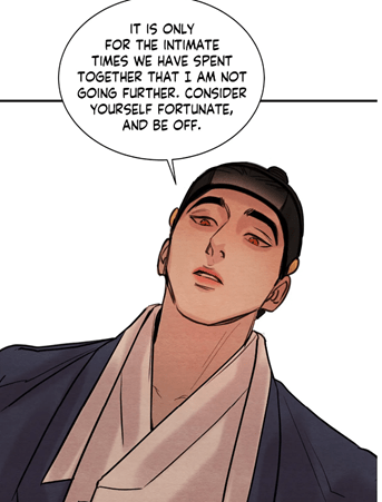 These words truly expose that he isn’t paying attention to Jihwa’s needs and doesn’t focus on giving him pleasure. It was all about his own ecstasy and sexual enjoyment. But since Jihwa is used to Seungho’s selfishness, he didn’t pay too much attention. He was just happy that Seungho had now become a real homosexual and even felt enticed by him. That’s why he acts as if he was a lover after the sex session at the pavilion. Now, imagine his disappointment. In chapter 5, Jihwa comes back only to discover that the attraction and excitement was so short-lived. He can’t focus on him because of the painter, hence he sends the noble away: