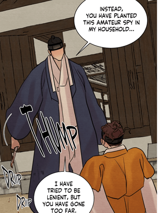But what he didn’t expect is that the noble would rush to the teacher’s room, and not to the study. However, his delay could be explained differently. He had been busy giving the sentence to Deok-Jae, the straw mat beating. And this leads me to the following observation: denunciation. In chapter 28, Deok-Jae covered up for Kim’s betrayal, for he hoped that Kim would come to protect him.