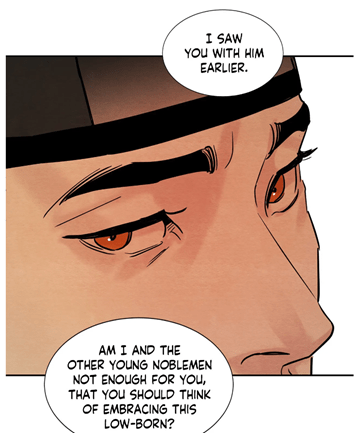 Striking is that the noble has a similar reaction than in the chapter 21. He is annoyed but no longer angry. At least, he has been able to obtain something. He is no longer rejected but you can feel his dissatisfaction. He would like to be loved and admired like Jung In-Hun, but this will do now for him.