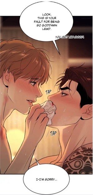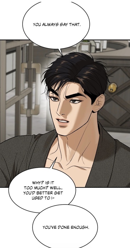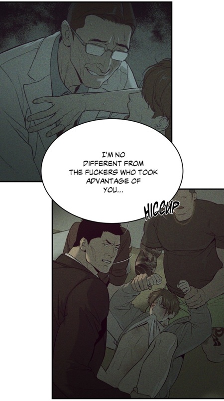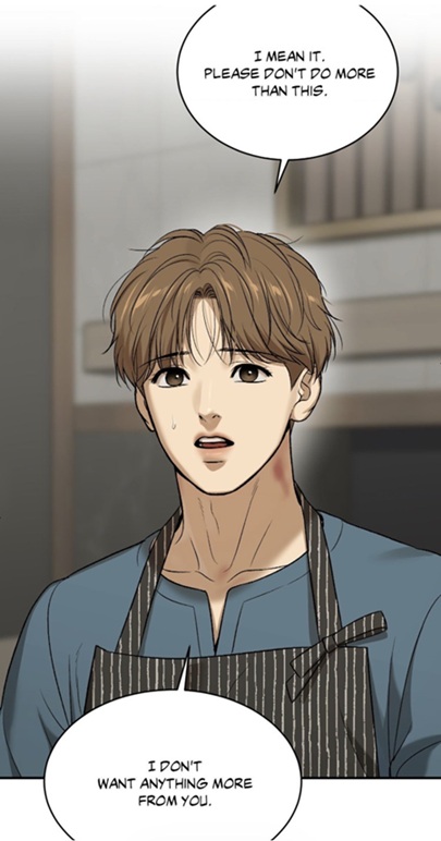 (Chapter 67) As you can see, the absence of the excuse from the uke and his father outlines that chapter 67 is a reflection of episode 5 and 77. I detect a pattern, chapter 5 contains a superficial apology, chapter 67 no apology and chapter 77 a fake excuse again. Furthermore the manhwalovers can recognize that in the same episode (episode 5), the antagonist Jihwa had indeed wounded the painter with his insult too, a reflection of episode 4.