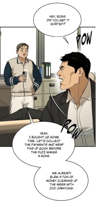 (chapter 93) The reply reveals the underlying problem: they have already spent a considerable amount of money cleaning up the mess connected to Joo Jaekyung. The champion’s televised revelation has created waves. People had to be silenced, favors had to be paid, and the organization now finds itself under financial pressure. Choi Gilseok even admits bluntly that money is tight.