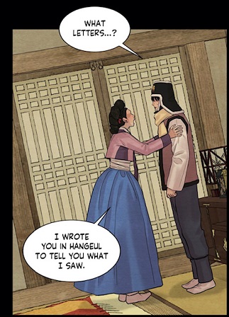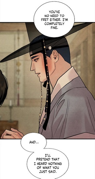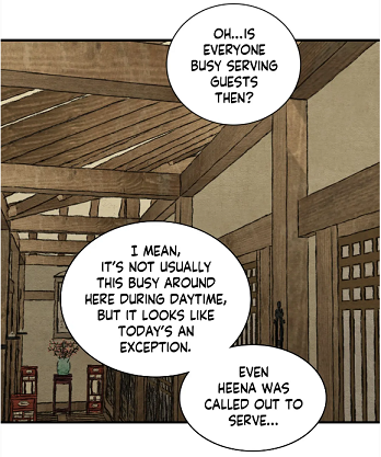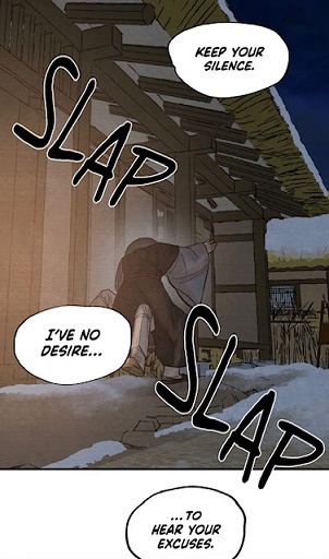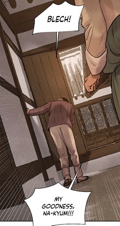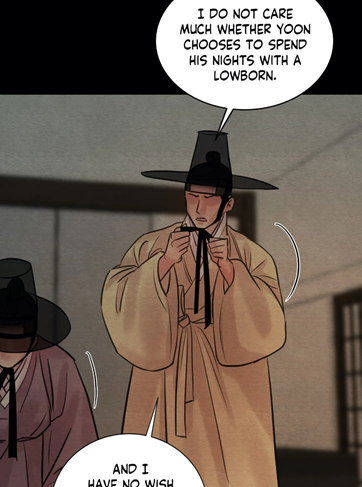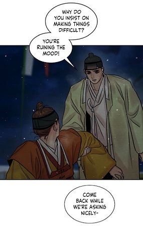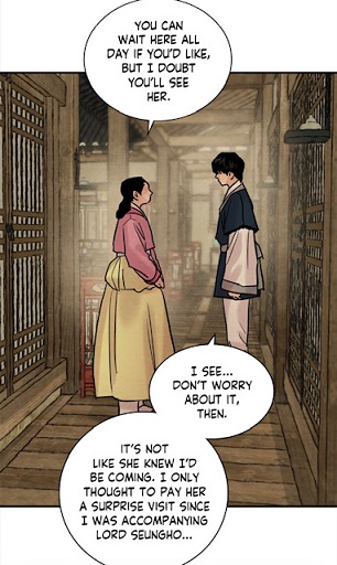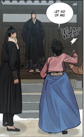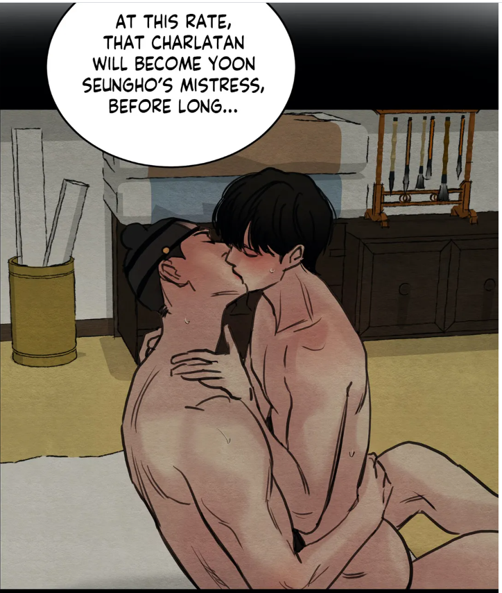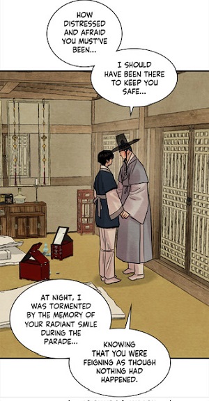 (chapter 17) that Yoon Seungho would come to perceive the painter as a man consumed by lust. He imagined that he would caught them fooling around. As you can see, this ruckus was also a plot, though it doesn’t look like one. Why would the maids gossip in the courtyard?
