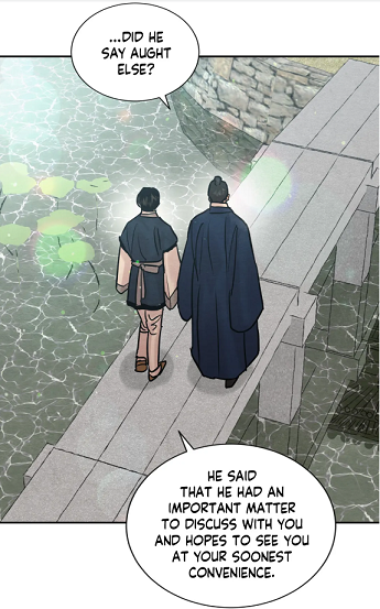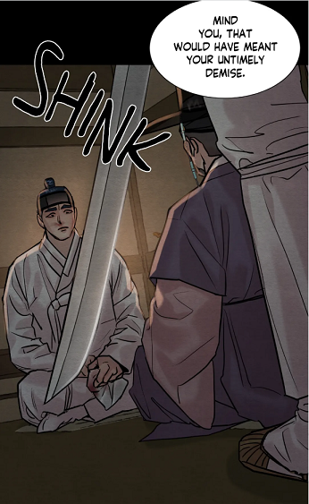 (chapter 82) Note that the aristocrat mentioned “punishment” in this context. So maybe, he denunciated the patriarch so that the whole family would get punished. Father Lee was definitely played in this scene, hence I believe that someone had already anticipated his reactions. He would seek revenge. But this doesn’t end here. I had connected “rash departure” to “treason and spying”. And now, observe what Yoon Seungho said to his butler