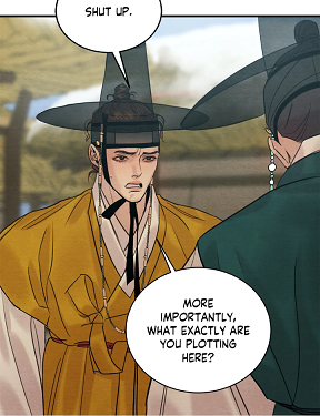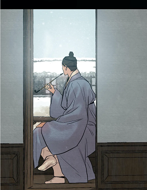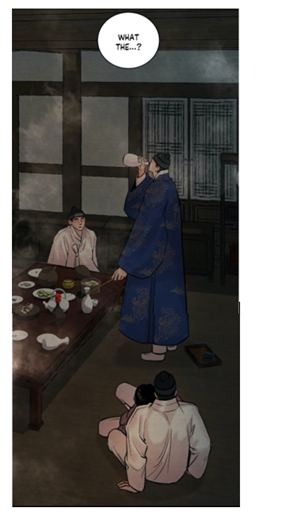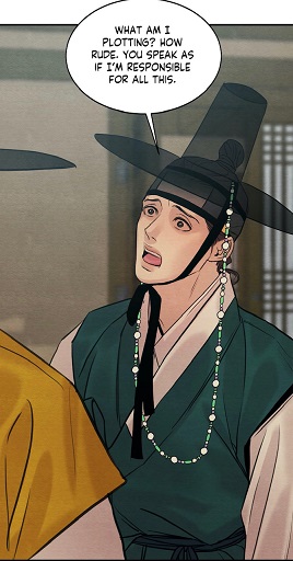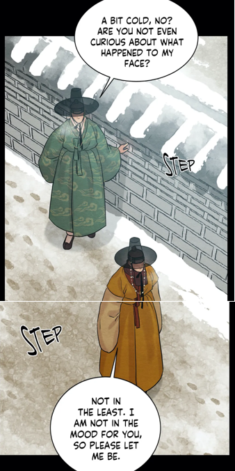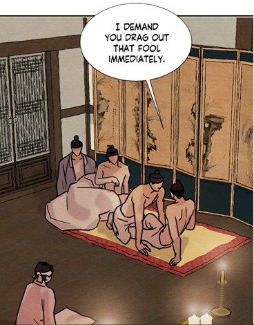 (chapter 32) The manhwaphiles can sense the similarity in the vocabulary: for Min, it is fun/entertainment, while Kang Moor keeps talking about “pleasure”. Since Kang Moo recognized the repercussions of a murder, he chose to fight against it contrasting to Min’s attitude. And there’s reason for that: Min’s social status and historical period. The latter is a noble and can use his superiority to hurt commoners and even break laws, because aristocrats are not prosecuted like low-borns. Secondly, I believe that his family and his surroundings played a huge role. Observe that the nobility is portrayed as corrupt and decadent. Besides, the manhwalovers should remember that Min’s MO is to manipulate others, therefore it reveals that the character had found a way out how to outlive his “urge and need”. He could commit small wrongdoings, as he knew that he wouldn’t get punished for this. But if he had to hurt another noble, he had to use someone else. And this exposes the similarities between Kang Moo and Min. Both are well aware that certain things are not allowed, yet they try to find a different way to move around the rules and laws.