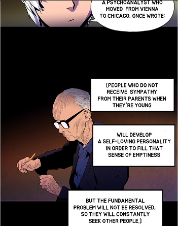 (chapter 35), as he has been clinging onto the poor student while guilt-tripping him. According to Gyujin, Soo-Young used him to discover his sexual orientation. His hypocrisy, manipulations and hidden brutality make him look like a psychopath, or better said as someone suffering from Antisocial Personality Disorder. But he is not, in my eyes he is closer to someone suffering from NPD (Narcissistic Personality Disorder).