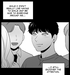 (chapter 16) The main lead explains that he chose to wear glasses, because he desired to avoid rejection and fear. He had noticed that the absence of facial expressions (smile) and his cold gaze would be misjudged by people. Here, Matthew used the glasses as protection. And this illustration reinforces my interpretation: glasses in manhwas have a huge importance in the end, they should be considered as masks too.