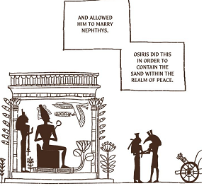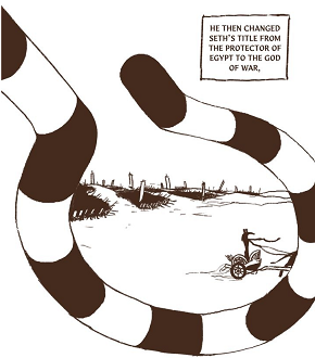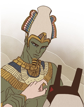 (chapter 7) Sure, the color refers to his death, a decayed body, nonetheless the readers should judge the painting as a cover. Since he is using a whole body to disguise himself, this signifies that he is hiding his true personality and thoughts more than Isis or Ra. That’s why it is not surprising that this god is particularly scheming and deceptive.