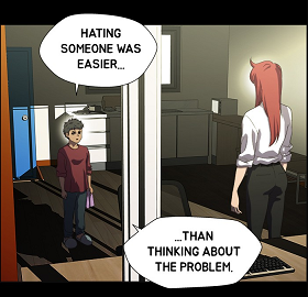 (chapter 2) But the readers are left in the dark about the nature of their past relationship. It was, as if Soo-Young had been a victim of bullying and was coerced to live as an outcast. This panel illustrates his isolation perfectly.