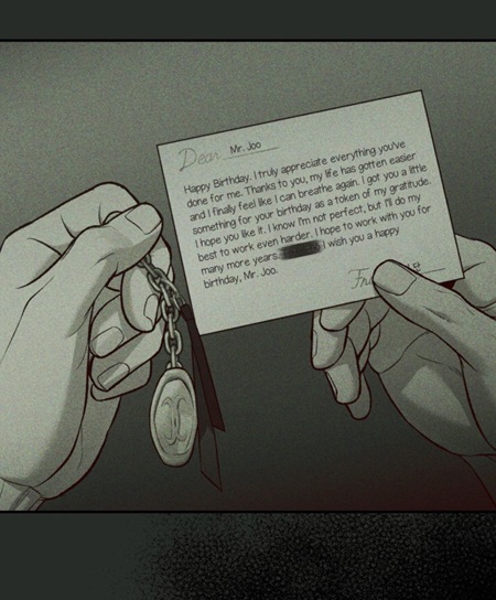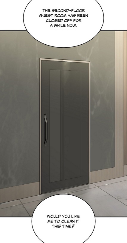 (chapter 55) The space is sealed off, preserved, treated almost as a forbidden zone. The cleaning staff is not allowed to enter. Nothing is moved, corrected, or neutralized. The room becomes a reliquary rather than a dwelling — a place frozen in the moment of loss. Joo Jaekyung does not confront what happened there; he keeps it intact, untouched, and therefore unresolved. At the same time, he imagines that avoiding that place will help him to forget doc Dan’s gaze and face.