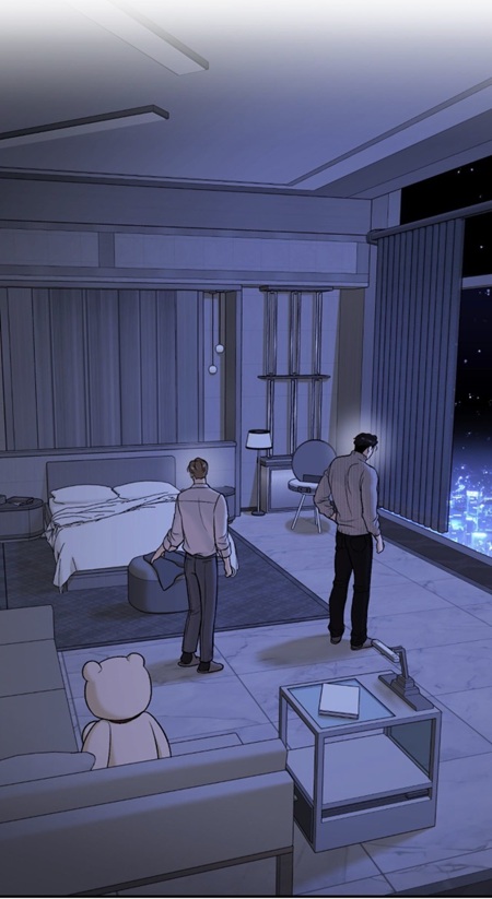 (chapter 64) Only when they would truly face each other, they would be more honest and expose their thoughts and emotions. As soon as there is a table, a bed or a couch, I detected some restrain and silence. In other words, the presence of the teddy bear and the couch in that scene explains why Kim Dan is silent and passive after their conversation. He is definitely remembering the day and conversation at the amusement park.