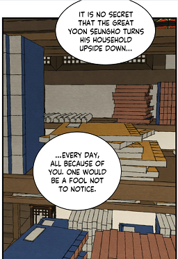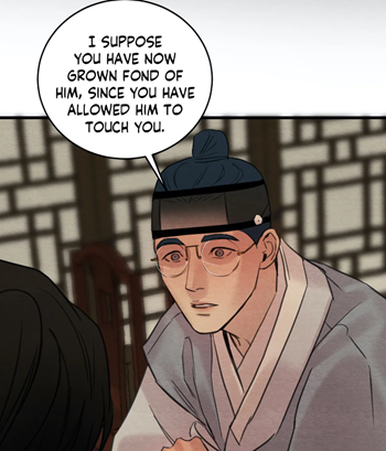 (Chapter 69) He was definitely happy that the commoner had chosen him. However, there’s still awkwardness between them, hence the noble can’t entirely trust him. And this lack of trust becomes a reality, when in chapter 80, the manhwaphiles witness that Yoon Seungho had threatened the kisaeng behind the painter’s back.