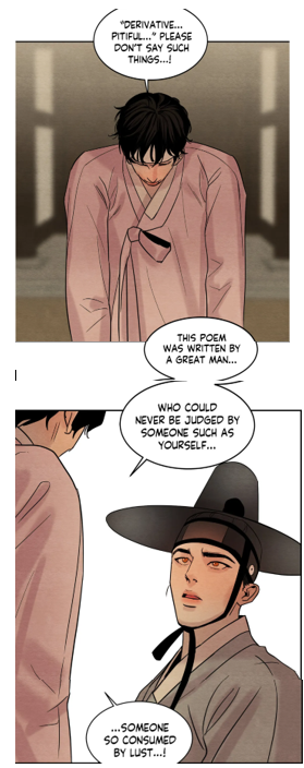 In order to understand why I came to this conclusion, it is relevant to examine the memories in chapter 40 due to the parallelism. There, the painter recalled the questions and comments from Yoon Seungho, which incited the commoner to ask his teacher about his future. Once the scholar had succeeded, would he become responsible for the painter, like he had implied? And observe that during the confrontation, the artist used a statement from the past: