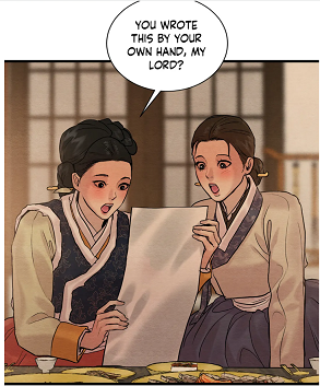 (chapter 91) The maid’s statement (“I’m surprised…”) truly exposes that the painter had such a reputation among the staff. The so-called treacherous nature of the painter served as a justification for Kim’s punishment. The butler’s kindness had been used against him. He had been sentenced to the straw mat beating, because he had allowed the noona to enter the mansion for the painter’s sake! In that scene, the maids had been tasked to leak a certain information to the couple: the existence of the kisaeng’s letters. That way, the painter could accuse his lover of his deception. He had kept away the letters from his noonas. However, the separation didn’t take place, because the painter didn’t hear the comment from the maid. He was no spy!