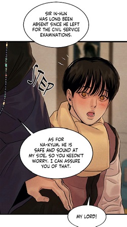 (chapter 55), deep down he sensed that his master had protected him. This night was important for the main lead: he was forced to admit his own feelings for the painter. Therefore, we could say that the issue with the prostitution was solved after chapter 54. Yoon Seungho thought that the moment he confessed, the painter would get scared and run away, but it didn’t happen. Why? Love among men and especially between a brutal noble and a commoner, was a taboo, like Min had underlined. Secondly, if the lord had indeed feelings for him, he had behaved like a beast during that night. He had mistreated Baek Na-Kyum. In his mind, the artist would never accept him.Besides, the painter had clearly denied the affection from the main lead. In his eyes, the painter’s words were indicating a rejection.