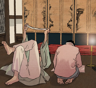 (Chapter 88) This contrasts to the sex session in chapter 48/49. The lord had used sex in order to force the painter to share what was on his mind. Finally, in the gibang, the painter had talked a lot about his childhood to his lover before kissing his lover.