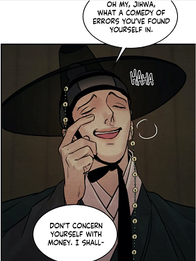(chapter 50) Therefore he chose to mislead the red-haired client, because he hoped that with time, the aristocrat would change his mind. However, in order to give Jihwa the impression that he was taken seriously, he gave a false excuse and explained that he needed some time. As you can see, exactly like Min, the commoner manipulated the instigator. Later, when the latter criticized the criminal for his inaction, the latter was the one who reminded the red-haired lord of the gravity of the crime: he intended to kill a person. The irony is that the assassin, a symbol for immorality, was actually playing the role of consciousness: