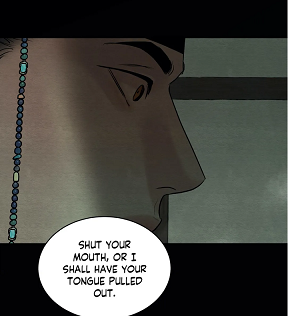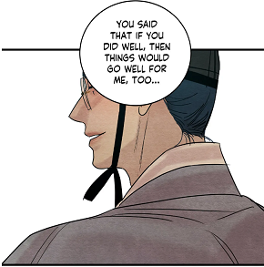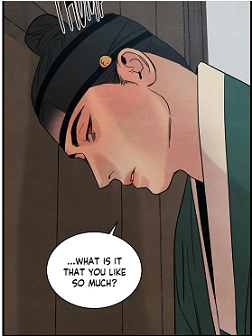 First, this indicates that the eldest master Yoon is still paying attention to Yoon Seungho’s behavior, and Kim is well aware of it. Imagine that Yoon Seungho used his bad reputation as a notorious hell-raiser in order to torment his father, yet the latter never intervened. This signifies that he could bear the humiliation, because the truth had not been unveiled. The father turned his own son into a black sheep, a sign that there’s actually something wrong in a family. However, it becomes a different story, when he hears that Jihwa has already confessed in public. It means that his son could definitely fall in love and this could also reach the king’s ears. If the lord maintains a terrible reputation, then no one will try to become his partner, hence the king’s position remains untouched. Notice that Kim is worried that the elder master hears about the confession, indicating that he is well aware about his doctrines. Love is a taboo. I doubt, he is referring to sodomy as such, because it is well known that Yoon Seungho sleeps with men. As a conclusion, this panel reveals that the lord was keeping an eye on his son all this time. Since he never meddled before, in his eyes, his son’s rebellion was nothing to worry about. Consequently, this is not surprising that the father and Seung-Won imagined that once asked by them, Yoon Seungho would obey and help them, because he had always done it before. Yet, this time, the main lead refused.