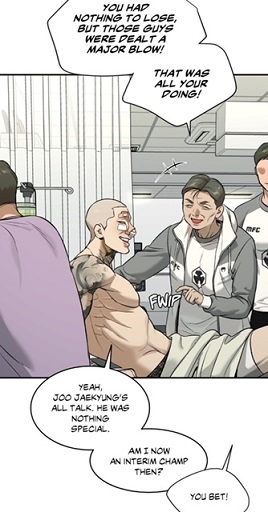 (chapter 45) By keeping Dan in the dark about the “surprise,” the fighters created another problem. Their silence pushed him to offer his own present on the same day as the gifts from sponsors and fans — exactly the kind of attention Jaekyung resented. He had already said he did not want those presents, and now Dan’s sincere gesture was placed in the same category, indistinguishable from the flood of unwanted offerings. What could have been a private, meaningful moment was absorbed into the hollow ritual of the group. Hence the champion never got to read his card!