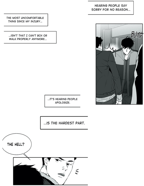 First, the reader think that he is a nice person because he is not indifferent to the former boxer Kwon Soo-Young. However, what follows is actually that the man is firing our protagonist with the excuse that he can’t bear to see the handicapped man working under these conditions. He explains that he couldn’t find him a desk job at his company hence he doesn’t want him here any longer. He thinks that this kind of job is too tiring and hard for a disabled man. So the supposed good man is forcing the main lead to resign, while the latter never complained about his job conditions. The first impressions of his words can be deceiving, in fact the employer is lying to himself thinking that he is doing a good deed.