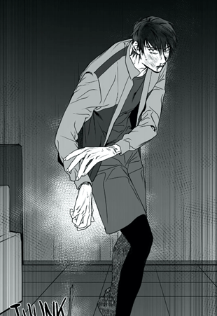 (chapter 08) In this scene, the charater is disguising his true thoughts. The black and red are representing his emotions: he is irritated, because he needs to have sex with Nam Dong-Gyun. Note how Ahn Jiwon is avoiding his counterpart’s gaze. The figure is acting, his mask is his face and the presence of the colors symbolizes the repressed and hidden thoughts and emotions. Mingwa colored one picture in chapter 51 marking a turning point in the protagonist’s life.